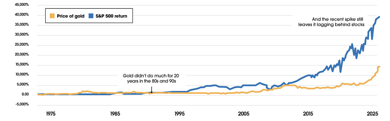 Sources: LBMA, Morningstar Direct, S&P Dow Jones Indices. February 1975 through February 9, 2026. Stocks represented by S&P 500 Index total return (including dividends); gold represented by LBMA Gold Price PM USD. Indexes are unmanaged portfolios and investors cannot invest directly in an index. Past performance does not guarantee future results.