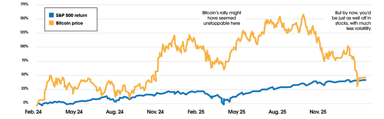 It’s understandable if you felt a bit of FOMO at this point last year – but if you look at the past two years, stocks have kept pace with bitcoin given its recent pullback.