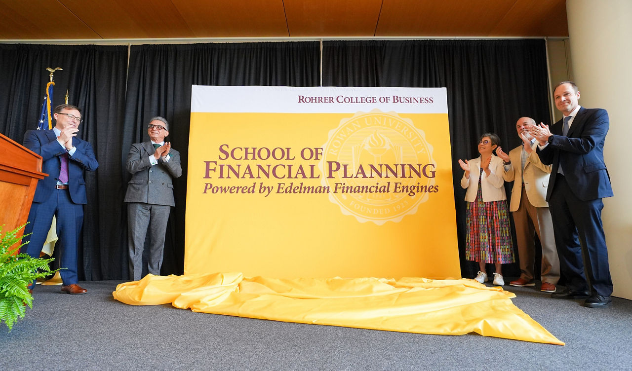 At the April 16 announcement of the historic Edelman Financial Engines gift, from left: Rohrer College of Business Dean Matthew Sarkees, Rowan University President Ali Houshmand, Rowan University Board of Trustees Member Jean Edelman, School of Financial Planning Founding Head Ric Edelman, Edelman Financial Engines CEO & President Ralph Haberli.